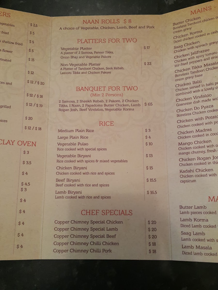 The menu features an enticing array of seafood dishes, such as Fish Masala Curry and Prawn Malabari, each boasting unique gravies and spices that promise to delight your palate for just NZ$20.00. For meat lovers, the Copper Chimney Specials, including Chilli Chicken and Special Beef, are prepared with meticulous attention, providing an unparalleled dining experience at NZ$25.00.
